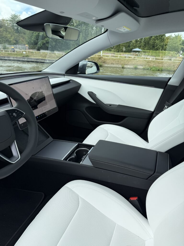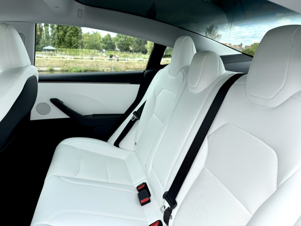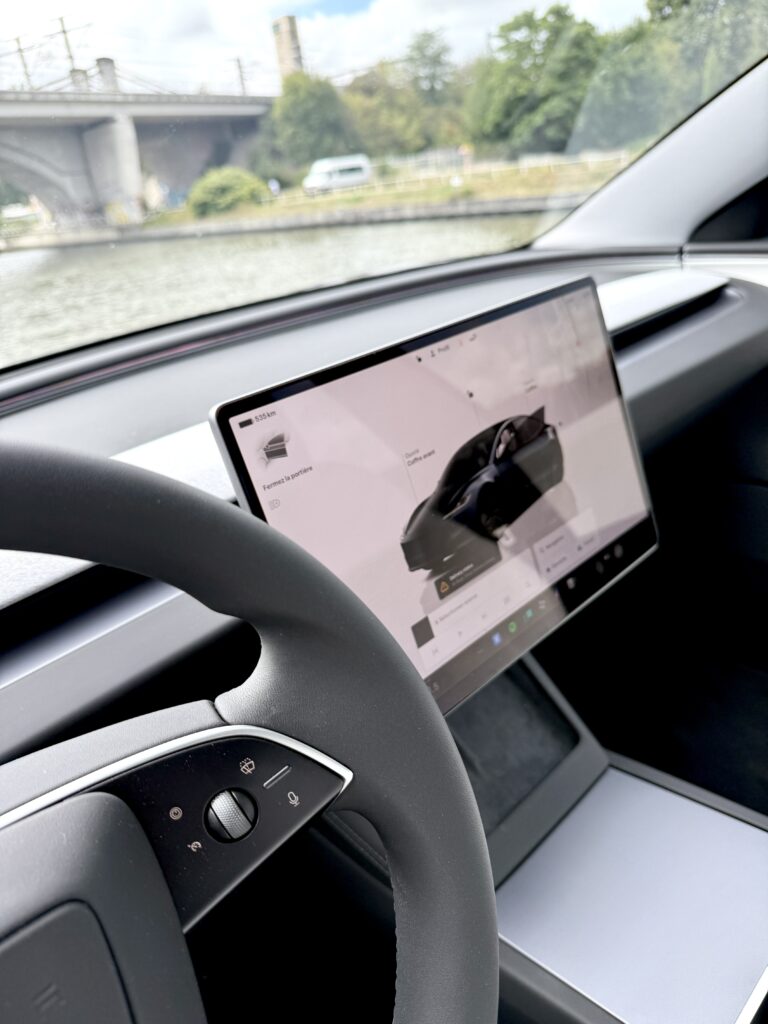 C’est à l’intérieur que la transformation est la plus sensible. Tesla Model 3 abandonne le plastique dur et les ajustements incertains qui faisaient tiquer les puristes. Les matériaux gagnent en densité, les assemblages en précision, et l’atmosphère en sérénité. Les sièges avant ventilés, les panneaux rétroéclairés, le double vitrage et les mousses acoustiques améliorées transforment la voiture en un cocon. Le silence n’est plus un effet secondaire : c’est une expérience. Tesla a aussi repensé la modularité : les passagers arrière disposent d’un écran tactile de 8 pouces pour le multimédia et la climatisation, tandis que le coffre (594 L au total) reste l’un des plus spacieux du segment. La suppression du commodo au profit de commandes tactiles au volant divise, mais s’inscrit dans la logique minimaliste de la marque.