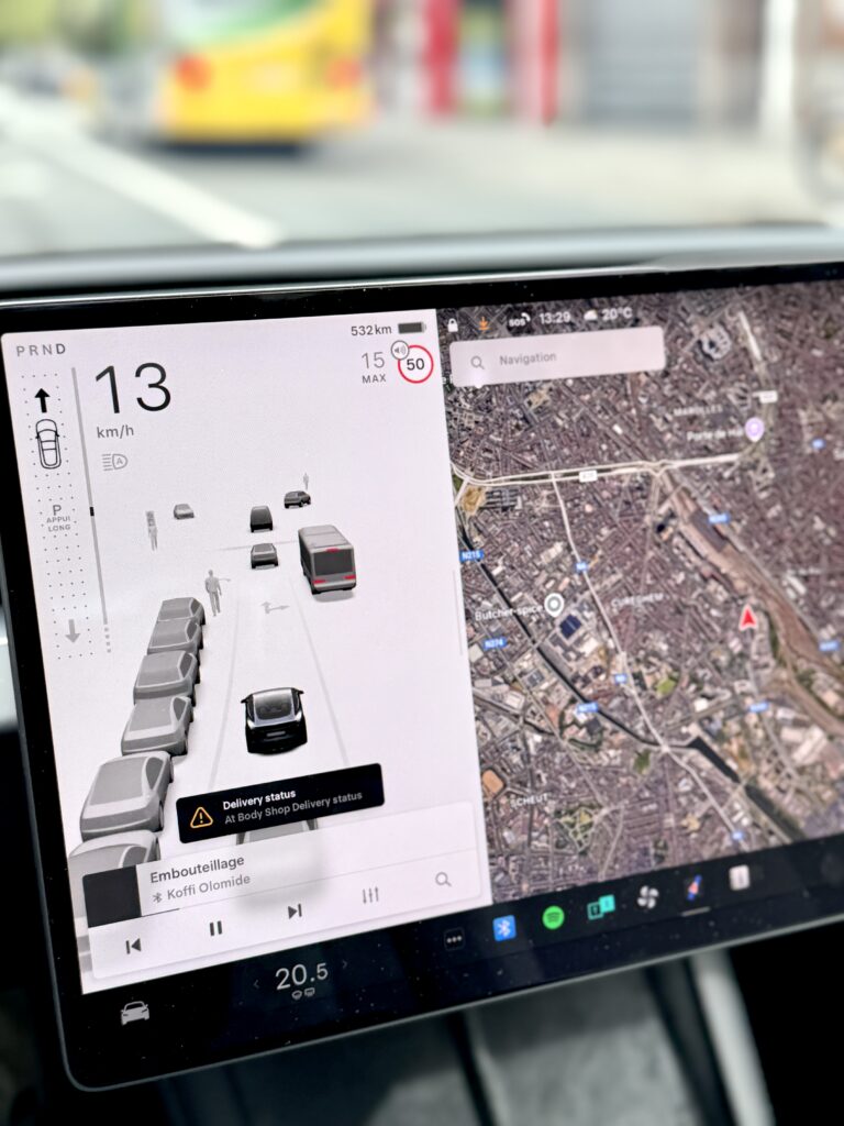 Chez Tesla, l’innovation ne s’exprime pas sous le capot, mais dans la carte mère. L’interface du grand écran central 15,4 pouces gagne en fluidité, la définition est plus fine, les transitions plus rapides. L’OS Tesla v12 apporte une ergonomie inspirée du design mobile : cartes personnalisables, raccourcis gestuels et gestion vocale améliorée. Le système audio – 17 haut-parleurs est d’une pureté rare. Le freinage régénératif se module par logiciel, tout comme la climatisation ou la répartition du couple. Et comme toujours, les mises à jour OTA (over the air) continuent d’enrichir le véhicule des mois après sa livraison. L’Autopilot gagne en souplesse, et la version Full Self Driving Beta 12.5 franchit une étape supplémentaire : anticipation plus fine des trajectoires et gestion intelligente des priorités. Loin du gadget, la conduite semi-autonome devient ici une forme d’assistance quasi organique.