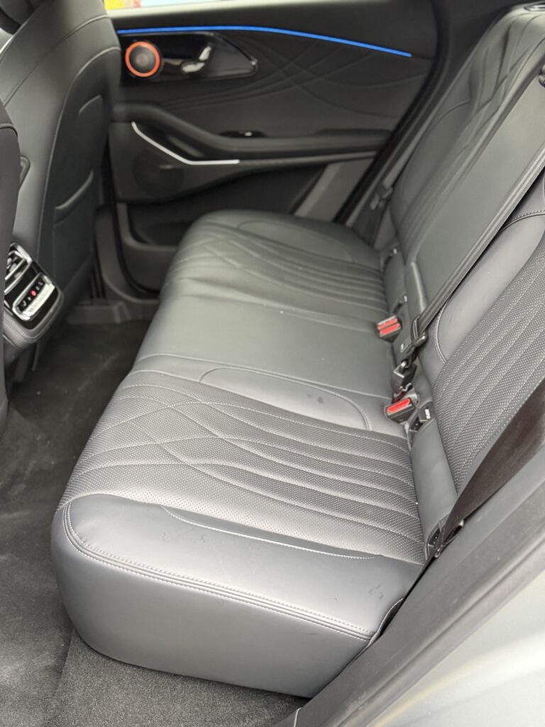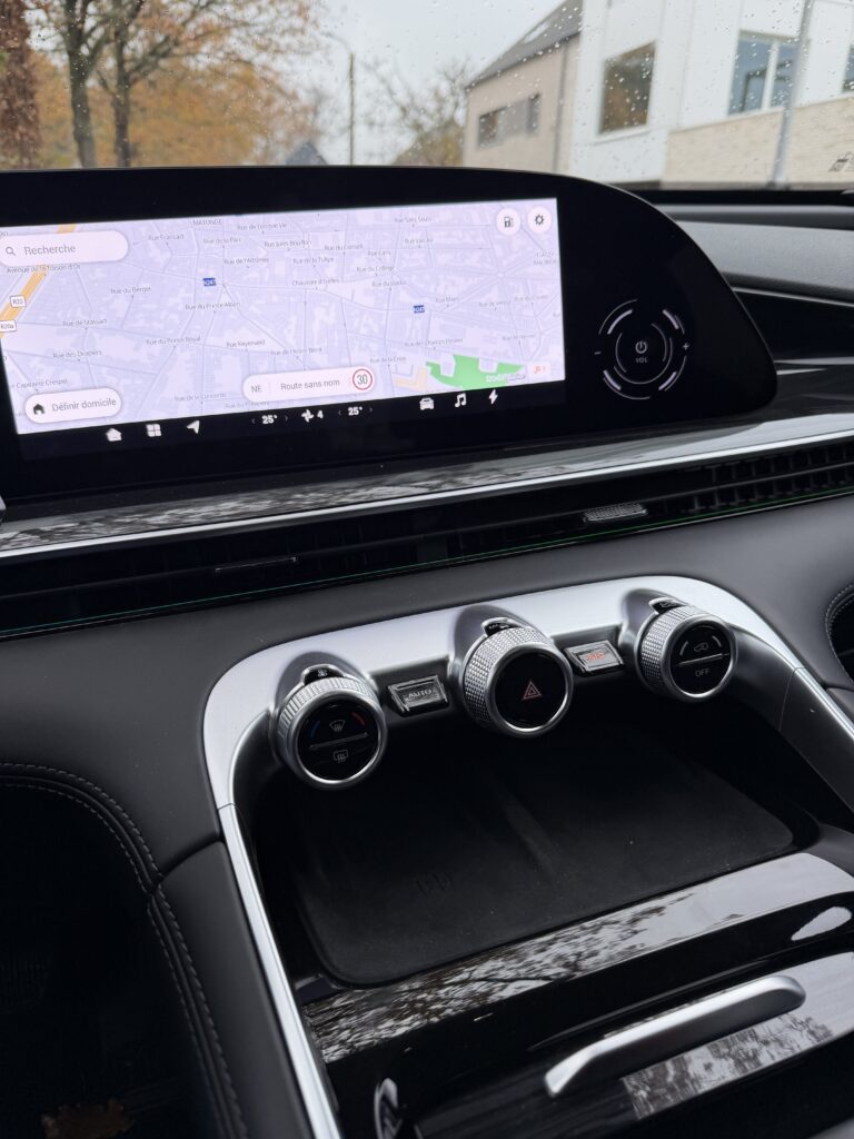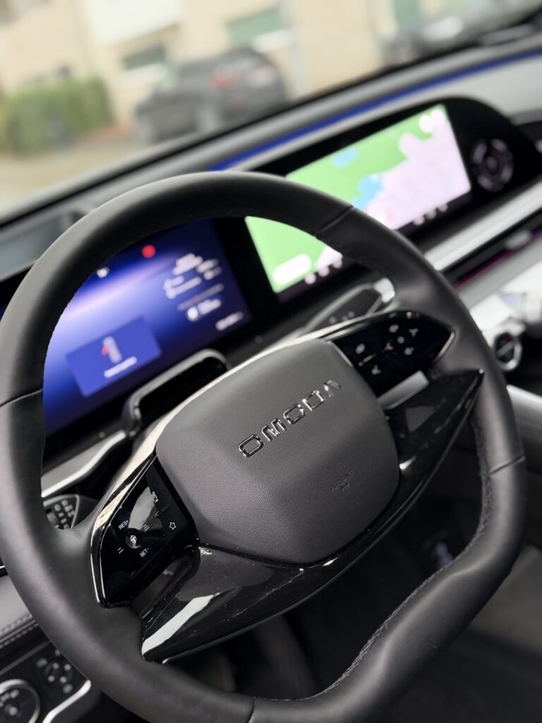 L’habitacle reflète cette ambition premium. Les matériaux, la présentation et l’ergonomie témoignent d’un réel effort qualitatif. Le double écran numérique centralise les informations de conduite et l’infodivertissement avec une interface fluide et intuitive. L’espace à bord est généreux, aussi bien à l’avant qu’à l’arrière. Les aides à la conduite de dernière génération (régulateur adaptatif, maintien de voie, surveillance des angles morts) participent à une conduite sereine.